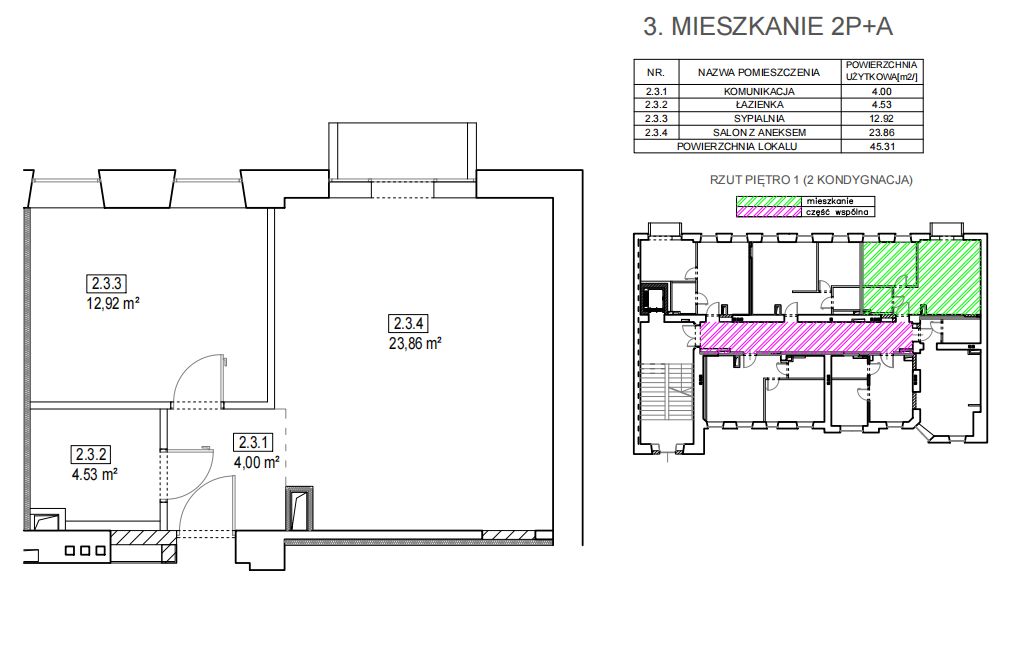 45 m2, pierwsze piętro, wys. 3.30m