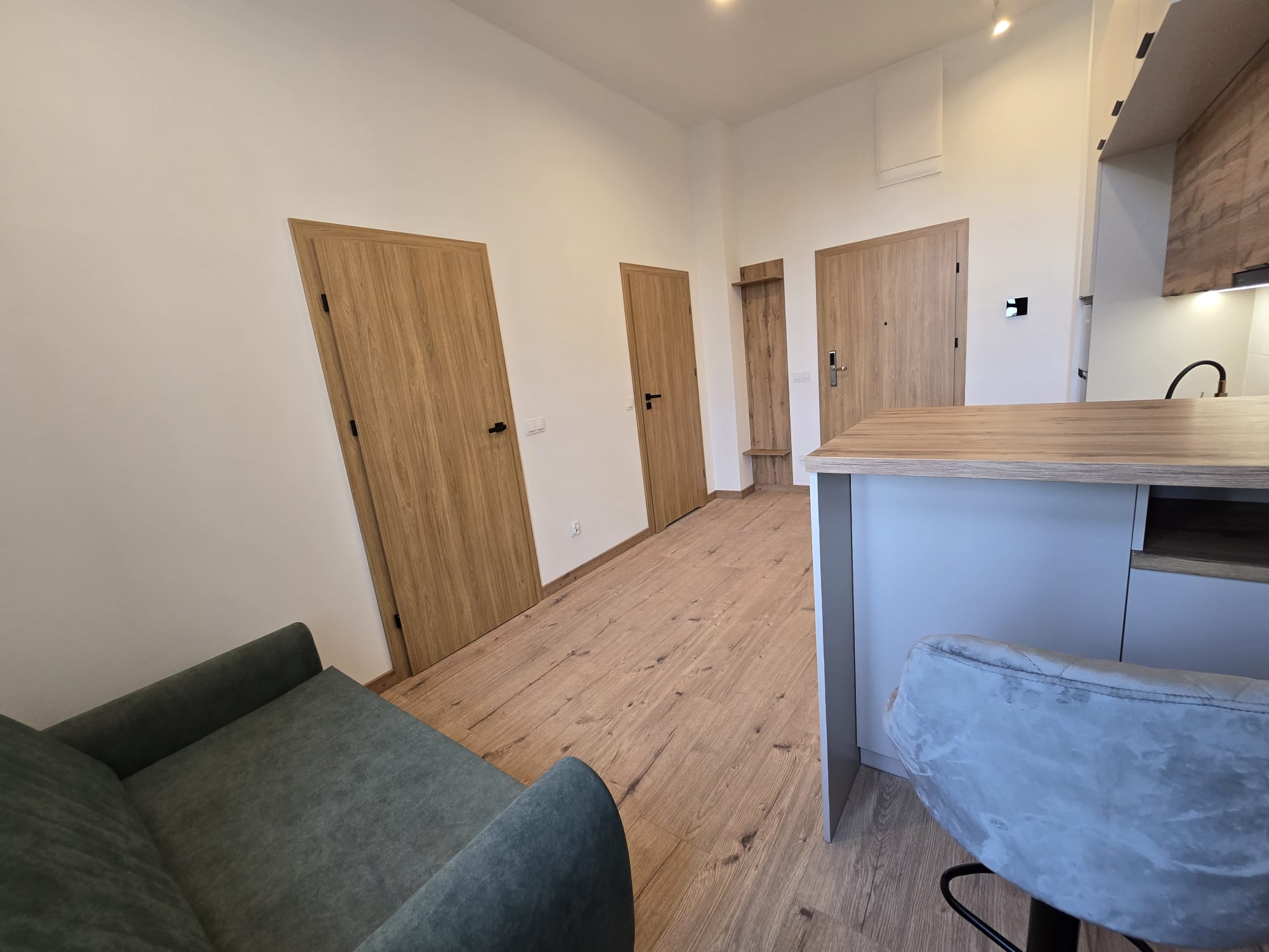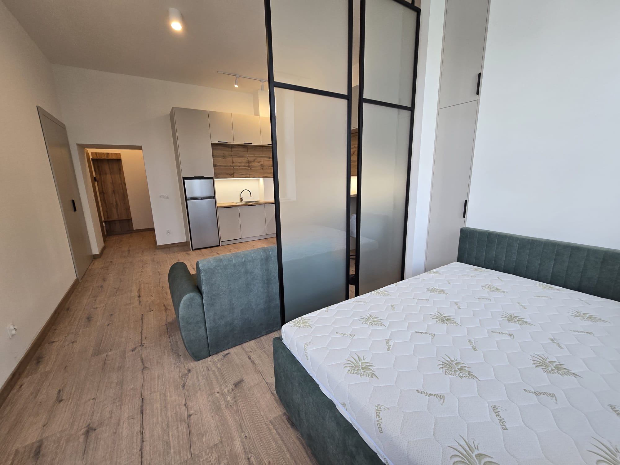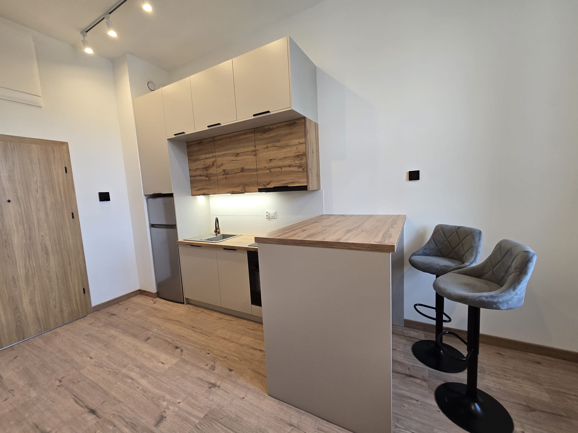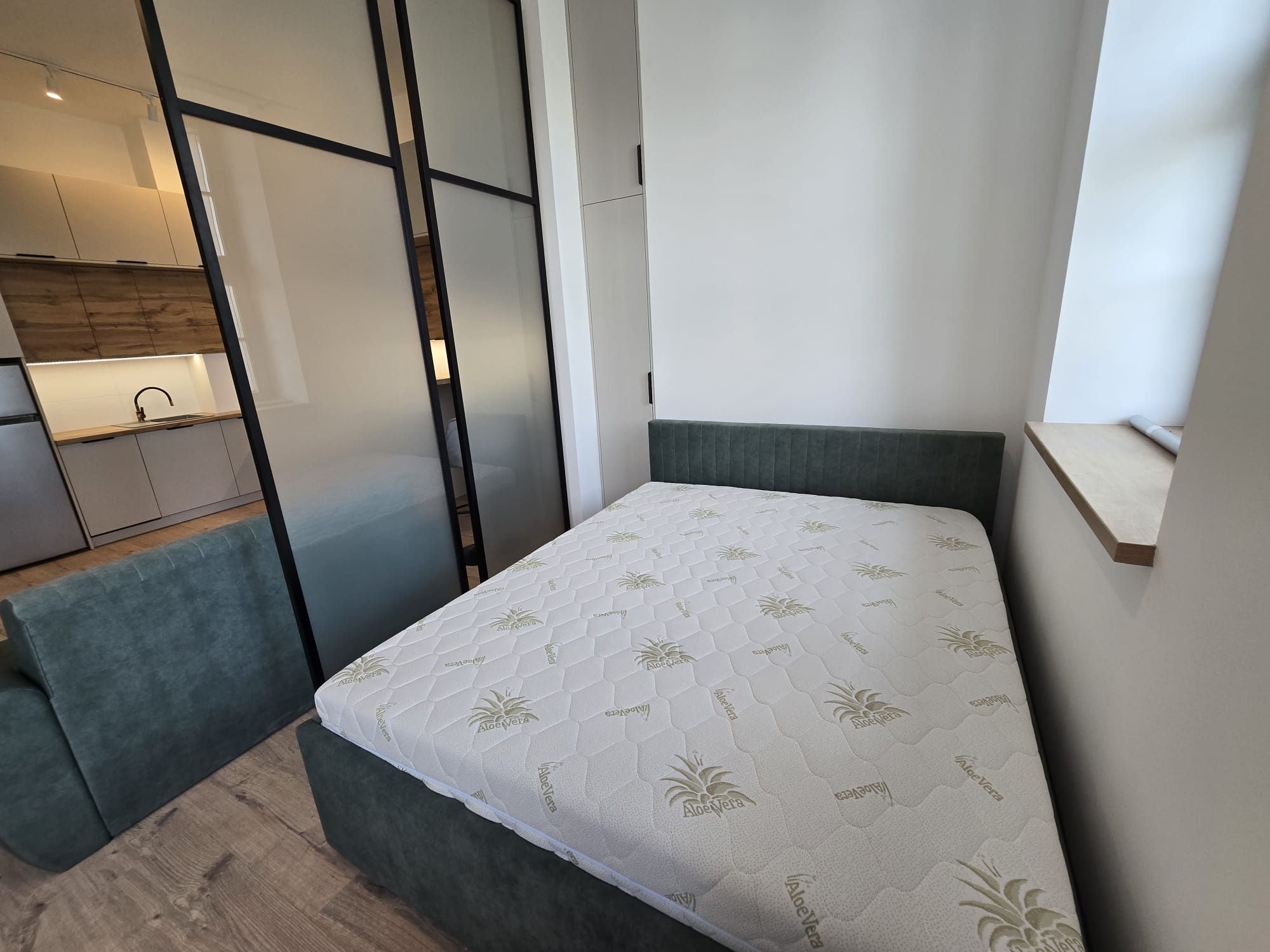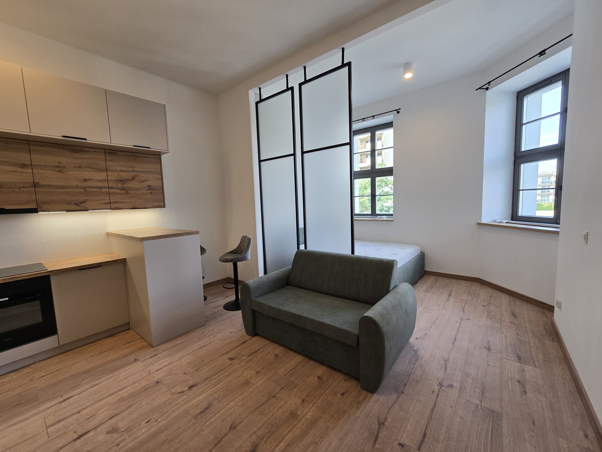 Apartament składa się z dużego pokoju dziennego z aneksem, sypialni i łazienki, część ma układ typu studio.